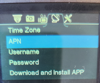 Once you have updated the firmware, switch the three-position switch to the middle SETUP position, press the MENU button, use the right arrow to go to the Cellular menu (satellite dish), then press the down arrow to go to APN, and press OK. Use the up/down arrows to enter the APN letters and full-stops as needed, and press the right arrow to go to the next letter. Press OK when done to save.