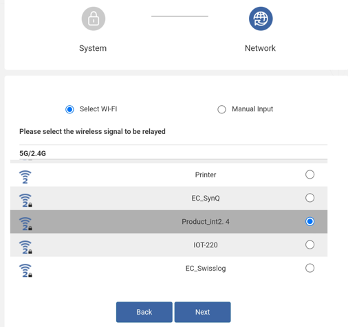 - Choose your existing ISP modem/router's Wi-Fi from the list and press Next