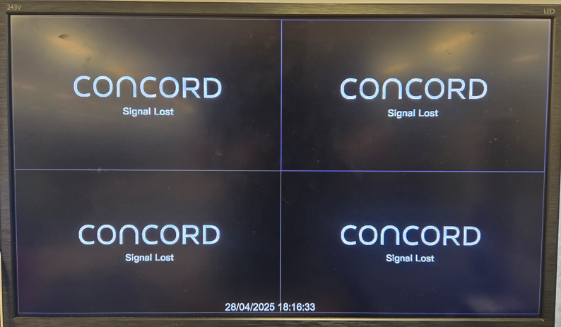 Problem: The cameras displayed on the screen connected to a Concord DVR (Model name CDKxxxx-x) all say "Signal Lost".