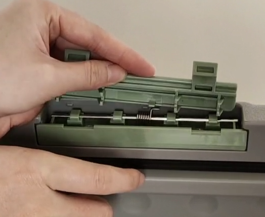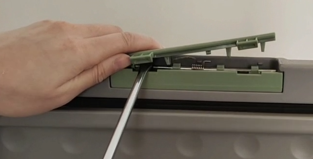 Lift the lid and use a flat blade to gently pry under the latch at the outside edge