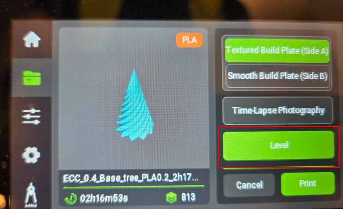 The Level Bed option appears on the screen when you load a file to print - make sure this is selected, as it will make sure the nozzle is the right height from the bed for great prints.