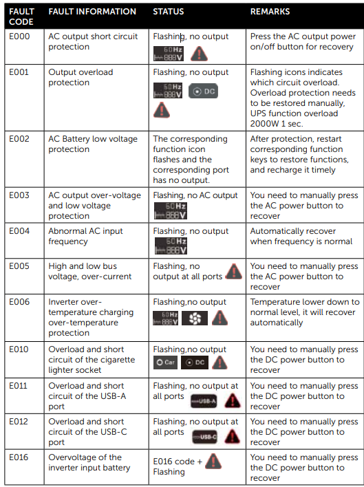 DC power should only need to be applied for a minute or two. This will reset the protection mode, and the unit can then be connected to mains power. When you hear the fans start to spin, the unit is successfully charging from mains, and the DC power input can be disconnected.